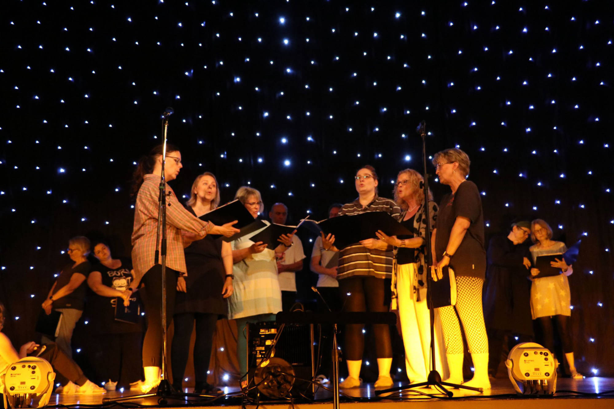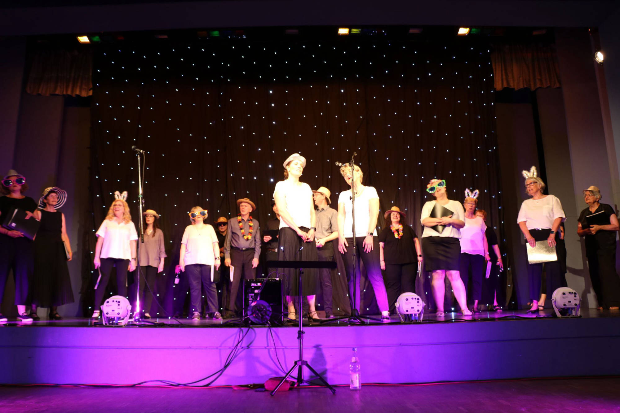 Schlaf, Liebe, Einsamkeit und Feiern zogen sich wie ein roter Faden durch die nun folgende Veranstaltung. Die Bühne war mit Sternenhimmel und farblich abgestimmten Licht vorbereitet, die Choreographie aufwändig einstudiert. „Sandmann, lieber Sandmann“ bildete, vom Pubikum gesungen, den Auftakt. Nun war klar: Der Schlafsand ist nicht weit. „The Lion sleeps tonight“, „Memory“, „Blue Moon“ und „Tourdion“ waren einige der nun dargebotenen Klassiker. Chorleiterin Imke Ortmann, am Piano hervorragend unterstützt durch Maike Jensen, bezog bei einzelnen Liedern, sowie zwischendurch, auch das Publikum weiter mit ein. Immer wieder wurde das Lied „Der Mond ist aufgegangen“ aufgegriffen, bis am Ende alle sieben Strophen gesungen waren. Bei den Liedern, hauptsächlich aus den Bereichen Oper, Pop und Musical, gab es mehrere Soloparts, welche die Zuhörenden besonders begeisterten. Insgesamt war es für aktiv und passiv Teilnehmende der Veranstaltung ein gelungener, schöner Abend.